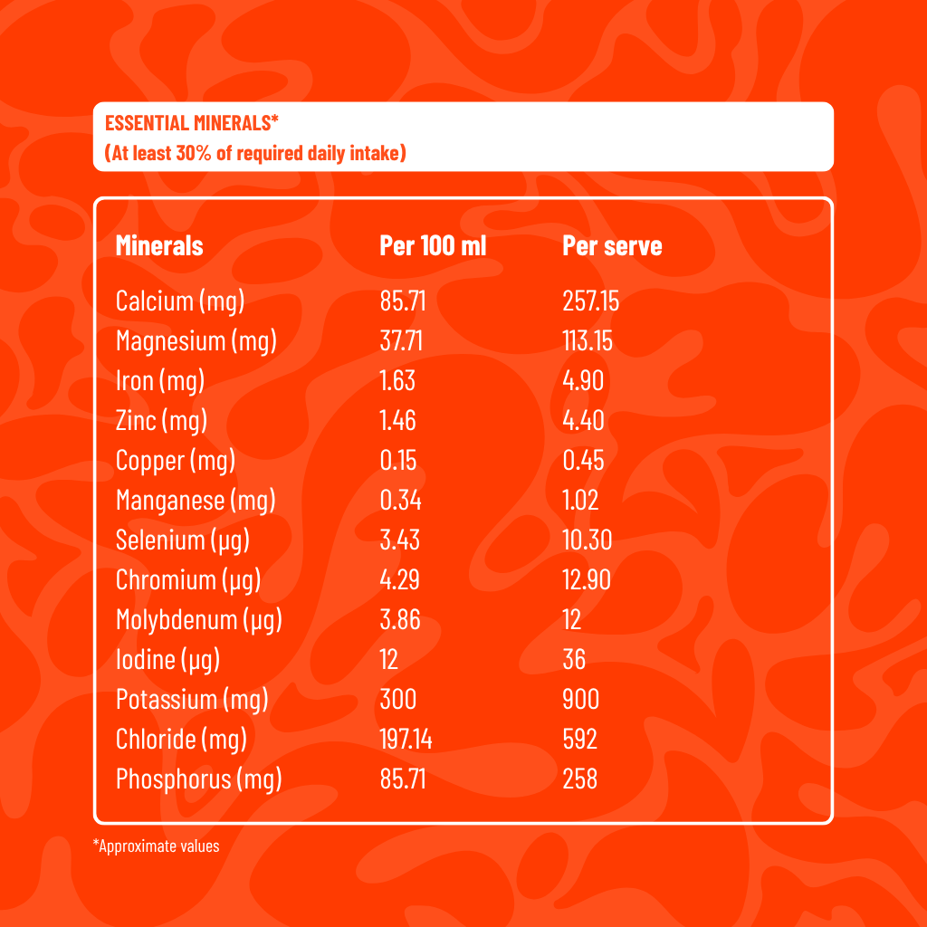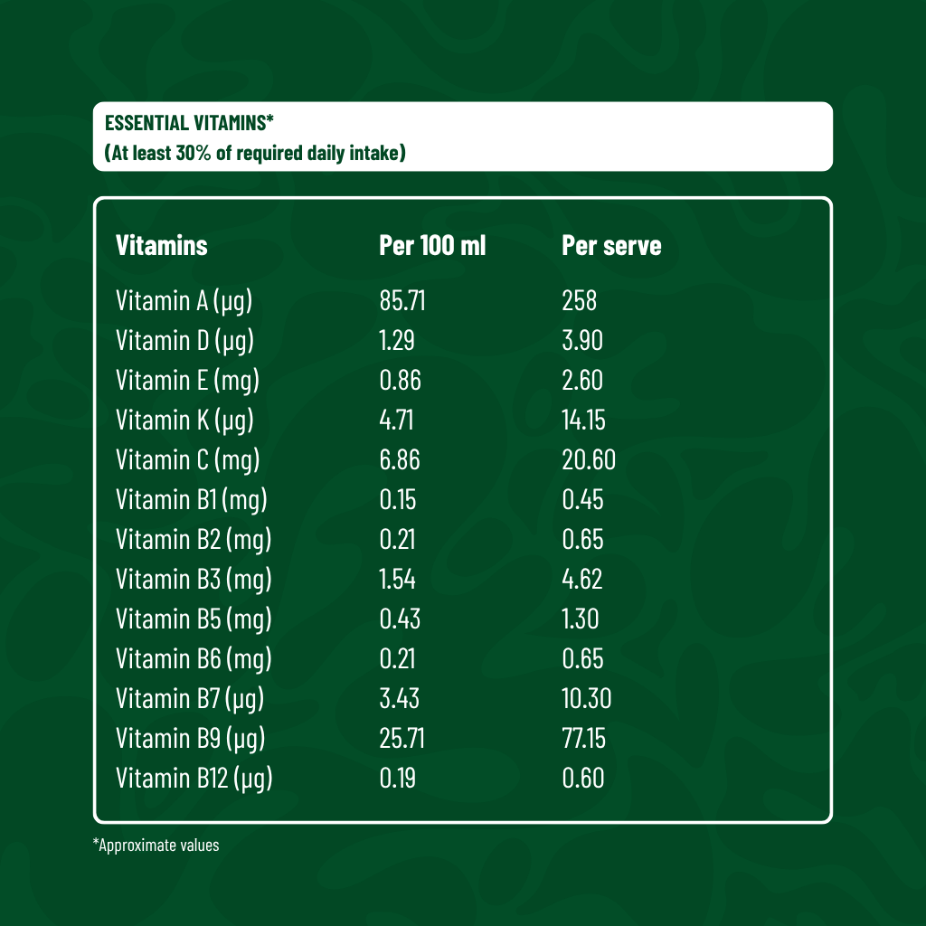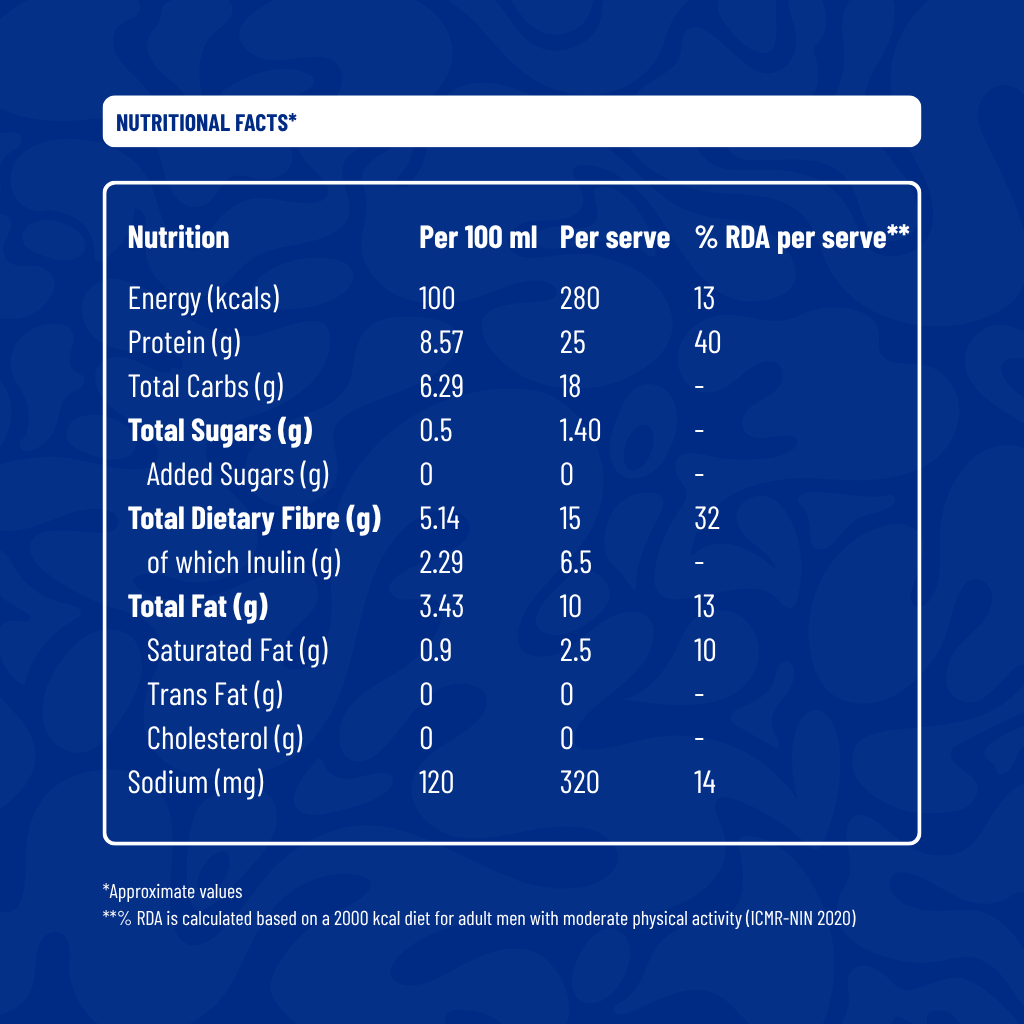 Each 280 ml serving delivers 25g protein, 15g fibre, 26 vitamins & minerals, and 3 hours of satiety. Light on taste, heavy on nutrition.